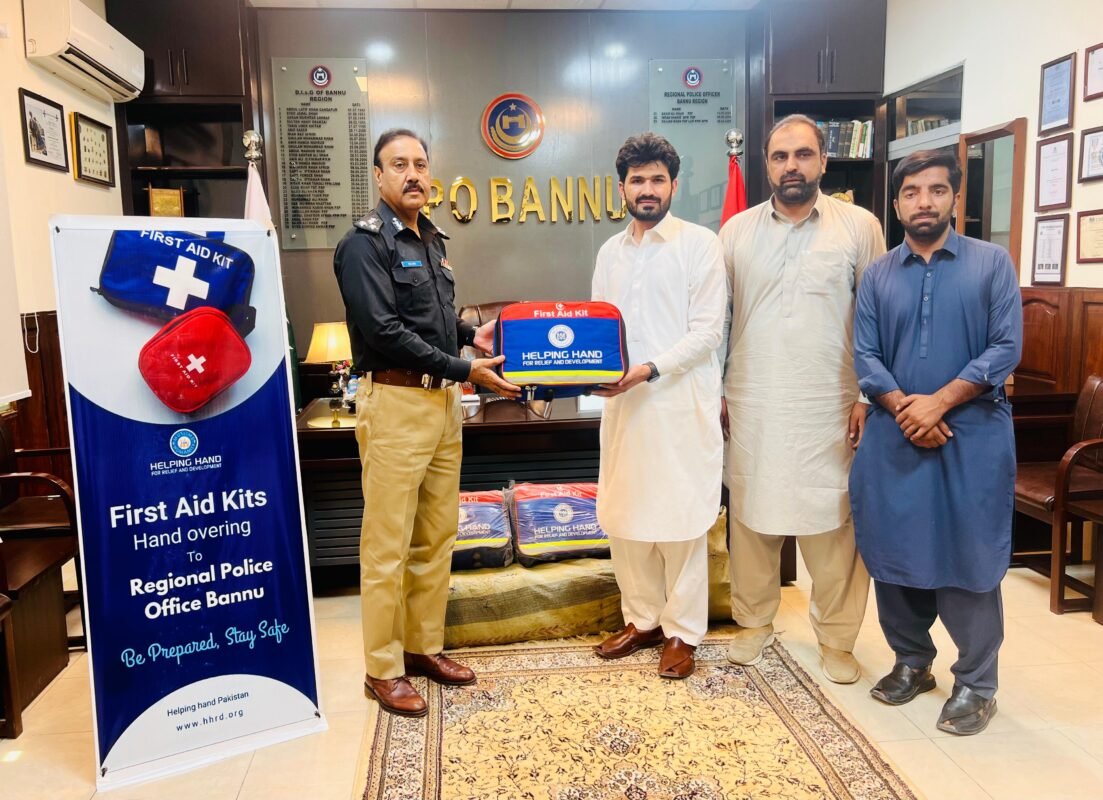 بنوں (نمائندہ خیبرنامہ) ہیلپنگ ہینڈ فار ریلیف اینڈ ڈویلپمنٹ پاکستان نے بنوں پولیس کے لیے فرسٹ ایڈ کٹس فراہم کیں۔ اس موقع پر نمائندوں نے ڈی آئی جی بنوں ریجن سجاد خان کو بریفنگ دی اور کٹس ان کے حوالے کیں۔ اس حوالے سے ہیلپنگ ہینڈ کے نمائندوں کا کہنا تھا کہ بنوں پولیس ہمیشہ عوام کے جان و مال کے تحفظ کے لیے صفِ اول میں کھڑی ہے، اور ان کی قربانیاں ناقابلِ فراموش ہیں۔ فرسٹ ایڈ کٹس فراہم کرنے کا مقصد یہ ہے کہ چوکیوں اور تھانوں میں ڈیوٹی کے دوران اگر کوئی اہلکار زخمی ہو تو اسے فوری طبی امداد میسر آسکے۔ اس موقع پر ایریا منیجر عبدالمنان شاہ، ڈسٹرکٹ کوآرڈینیٹر لکی مروت اعجاز الحق اور ڈسٹرکٹ کوآرڈینیٹر بنوں بلال احمد بھی موجود تھے۔ڈی آئی جی بنوں ریجن سجاد خان نے فرسٹ ایڈ کٹس مہیا کرنے پر ہیلپنگ ہینڈ کا شکریہ ادا کرتے ہوئے کہا کہ بنوں ریجن پولیس دہشتگردی کے خلاف فرنٹ لائن پر ہے، شہداء اور غازیوں کی قربانیاں ہماری تاریخ کا روشن باب ہیں۔ اس طرح کے اقدامات سے پولیس اہلکاروں کے حوصلے مزید بلند ہوتے ہیں۔