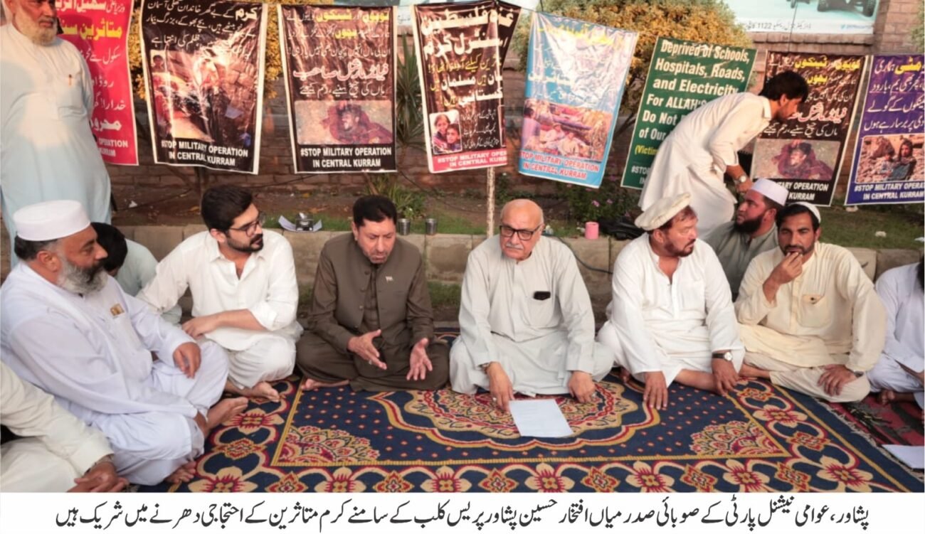 عوامی نیشنل پارٹی خیبر پختونخوا کے صدر میاں افتخار حسین نے کہا ہے کہ صوبائی حکومت متاثرین ضلع کرم کی آبادکاری سے مکمل طور پر غافل ہے۔ کرم کے عوام نے امن کی خاطر اپنے گھر بار قربان کیے، لیکن افسوس کہ آج تک انہیں امن کی ضمانت یا واپسی کا حق نہیں دیا گیا۔پشاور پریس کلب کے سامنے متاثرین کرم کے احتجاجی دھرنے میں شرکاء سے خطاب کرتے ہوئے میاں افتخار حسین نے کہا کہ ہزاروں خاندان آج بھی دربدر کی زندگی گزارنے پر مجبور ہیں، جبکہ حکومت نے ان کی واپسی اور بحالی کے لیے کوئی مؤثر پالیسی نہیں بنائی، جو کہ ایک سنگین غفلت ہے۔انہوں نے کہا کہ "یہ متاثرین اسی مٹی کے لوگ ہیں، اپنے ہی ملک میں بے گھر ہونا سب سے بڑی ناانصافی ہے۔ اگر یہ لوگ اپنے حق کے لیے آواز نہیں اٹھائیں گے تو کون اٹھائے گا؟ آخر کب تک یہ لوگ اپنے گھروں سے باہر رہیں گے؟”میاں افتخار حسین نے مطالبہ کیا کہ حکومت متاثرین کرم کی فوری واپسی کو یقینی بنائے، معاوضہ فراہم کرے اور بحالی کے لیے عملی اقدامات کرے۔انہوں نے خبردار کیا کہ دہشتگردی کے خلاف کسی بھی کارروائی سے پہلے عوام کو اعتماد میں لیا جائے۔ ان کا کہنا تھا کہ "اگر عوام کو اعتماد میں نہیں لیا جائے گا تو ایسی کارروائیوں سے امن کے بجائے بداعتمادی پھیلے گی۔”اے این پی رہنما نے کہا کہ جب افغانستان اور پاکستان یا پاکستان اور بھارت کے درمیان بھی سیزفائر اور مذاکرات ممکن ہیں، تو اپنے ہی عوام کے ساتھ بات چیت کیوں نہیں؟ انہوں نے سوال اٹھایا کہ اگر کارروائیاں عوام کے تحفظ کے لیے ہیں تو ان متاثرین سے بات کیوں نہیں کی جاتی؟میاں افتخار حسین نے مزید کہا کہ ملک کے حالات دن بدن خراب ہو رہے ہیں۔ ایک طرف بدامنی اور غیر یقینی کی فضا ہے، دوسری جانب قوم میں اتحاد کی شدید کمی ہے۔ یہ باہمی تقسیم ہی ہماری کمزوری بن چکی ہے جس کا فائدہ ہمیشہ دوسروں نے اٹھایا۔انہوں نے زور دیا کہ عوامی نیشنل پارٹی ہمیشہ امن، جمہوریت اور انسانی حقوق کی سیاست کرتی رہی ہے اور آج بھی اسی مؤقف پر قائم ہے۔ بدامنی کسی ایک علاقے کا نہیں بلکہ پورے ملک کا مشترکہ مسئلہ ہے، جس کے حل کے لیے تمام قوتوں کو متحد ہونا ہوگا۔آخر میں میاں افتخار حسین نے صوبائی اور وفاقی حکومتوں سے مطالبہ کیا کہ وہ متاثرین کرم کے تمام جائز مطالبات تسلیم کریں، ان کی واپسی کے لیے واضح پالیسی بنائیں، معاوضہ فراہم کریں اور مستقل امن کے قیام کے لیے سنجیدہ اقدامات کریں۔