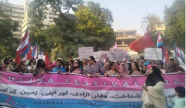 برنس گارڈن کراچی ہفتہ کے روز رنگوں، موسیقی، نعروں اور دھمال سے گونج اٹھا جب خواجہ سرا کمیونٹی نے “ہیجڑا فیسٹول 2025” منایا۔ فیسٹول میں شرکت کرنے والے خواجہ سراؤں نے اپنے منفرد انداز سے سماج کو واضح پیغام دیا کہ “ہم بھی اسی زمین کے وارث ہیں، ہمیں نظرانداز نہ کیا جائے!”رنگ برنگے لباس، موسیقی کی تھاپ، اور دھمال نے فیسٹول کو ایک نئے رنگ میں رنگ دیا۔ ریلی برنس گارڈن سے شروع ہوئی جو جوش و جذبے کے نعروں کے ساتھ پنڈال میں اختتام پذیر ہوئی۔ شرکاء نے “شناخت دو، عزت دو، روزگار دو” کے نعرے لگاتے ہوئے سماج سے برابری کے سلوک کا مطالبہ کیا۔خواجہ سرا رہنما کامی چوہدری نے جذباتی انداز میں کہا،> “ہم اسی معاشرے کا حصہ ہیں، مگر آج بھی ہمیں اپنی پہچان کے لیے لڑنا پڑتا ہے۔ ہمیں عزت، شناخت اور روزگار چاہیے، بھیک نہیں!”فیسٹول کا تیسرا ایڈیشن اس بار ماحولیات کے تحفظ سے منسوب تھا۔ کامی چوہدری اور ڈاکٹر سارہ گِل نے کہا کہ خواجہ سرا کمیونٹی بھی ماحولیاتی تباہ کاریوں سے متاثر ہے، اس لیے وہ اپنی شناخت اور زمین دونوں کی حفاظت کے لیے آواز اٹھا رہی ہے۔تقریب کے اختتام پر شرکاء نے رقص و موسیقی کے ساتھ ایک پرجوش قرارداد منظور کی، جس میں حکومت سے مطالبہ کیا گیا کہ خواجہ سرا کمیونٹی کو برابر کے شہری حقوق، تعلیم، روزگار اور تحفظ فراہم کیا جائے۔برنس گارڈن کا فضا طویل عرصے بعد اس قدر رنگین اور پرجوش نظر آئی، جیسے کراچی نے ایک نئی شناخت کو دل سے قبول کر لیا ہو۔