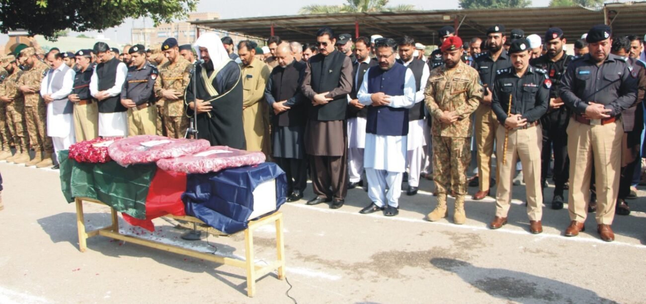 پشاور(مدثر زیب سے) سی ٹی ڈی تھانہ میں پیش آنے والے واقعہ میں شہید سی ٹی ڈی پولیس اہلکار بلال خان کی نماز جنازہ ملک سعد شہید پولیس لائن میں سرکاری اعزاز کیساتھ ادا کردی گئی۔ شہید کی نماز جنازہ میں گورنر خیبر پختونخوا فیصل کریم کنڈی، آئی جی پولیس ذوالفقار حمید، ایڈیشنل آئی جی سی ٹی ڈی جواد قمر، سی سی پی او پشاور ڈاکٹر میاں سعید احمد، پاک آرمی حکام، ایس ایس پی آپریشنز مسعوداحمد، ایس ایس پی سی ٹی ڈی نجم الحسنین، ایس ایس پی کوارڈی نیشن خالد خان،ایس پی ہیڈ کوارٹرز علی گوہر، ڈویژنل ایس پیز، ایس ڈی پی اوز سمیت شہید کے لواحقین اور پولیس افسران واہلکاروں نے کثیر تعداد میں شر کت کی۔اس موقع پر اور پولیس کے چاق و چوبند دستے نے سلامی پیش کی،گورنر خیبر پختونخوا، پولیس افسران اور پاک آرمی حکام نے شہید کے تابوت پر پھول چڑھائے اور شہید کے بلنددرجات کیلئے دعا کی۔
