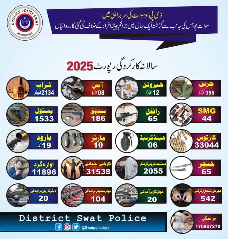 خیبر پولیس کی جانب سے جاری کردہ ایک سالہ کارکردگی تشہیری رپورٹ کے مطابق ضم اضلاع میں منشیات اور غیر قانونی اسلحہ کے خلاف سب سے زیادہ کارروائیاں کی گئیں جن کے دوران کروڑوں روپے مالیت کی منشیات اور اسلحہ برآمد کیا گیا۔ رپورٹ میں بتایا گیا ہے کہ خیبر پولیس نے منشیات اور غیر قانونی اسلحہ کے خاتمے کے لیے مؤثر سرچ اینڈ اسٹرائیک آپریشنز کیے جن کے نتیجے میں بھاری مقدار میں منشیات اور اسلحہ ضبط کیا گیا اور اہم ملزمان کو گرفتار کیا گیا۔