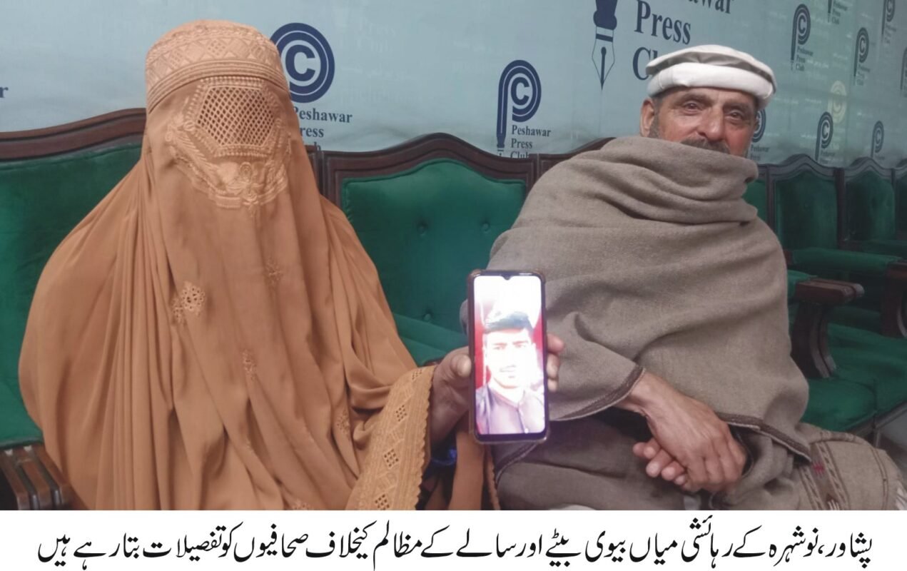 پشاور(مدثرزیب سے) نوشہرہ کے رہائشی میاں بیوی بیٹے اور بھائی کے مظالم کے خلاف پشاور پریس کلب پہنچ گئے۔ صحافیوں سے گفتگو کرتے ہوئے شکیل احمد اور بیوی سعدیہ آفریدی نے بتایا کہ 6 جنوری کو میرا بیٹا شہزاد میرے سالے نور محمداور اپنے سسر عطاء اللہ کے ساتھ ہمارے گھر آئے۔ رات کو جب ہم محو خواب تھے مذکورہ افراد نے ہم پر بے ہوشی کا سپرے کیا اور گھر سے آلٹو گاڑی، آٹھ لاکھ روپے نقدی، دو تولے سونا،میرا لائسنس یافتہ پستول اور گھر کے کاغذات وغیرہ اپنے ساتھ لے گئے۔ اس کے بعد تورڈھیر میں میری دکان پر گئے اور دکان میں موجود کپڑے، سولر اور بیٹریاں وغیرہ بھی لے کررفوچکر ہوگئے۔