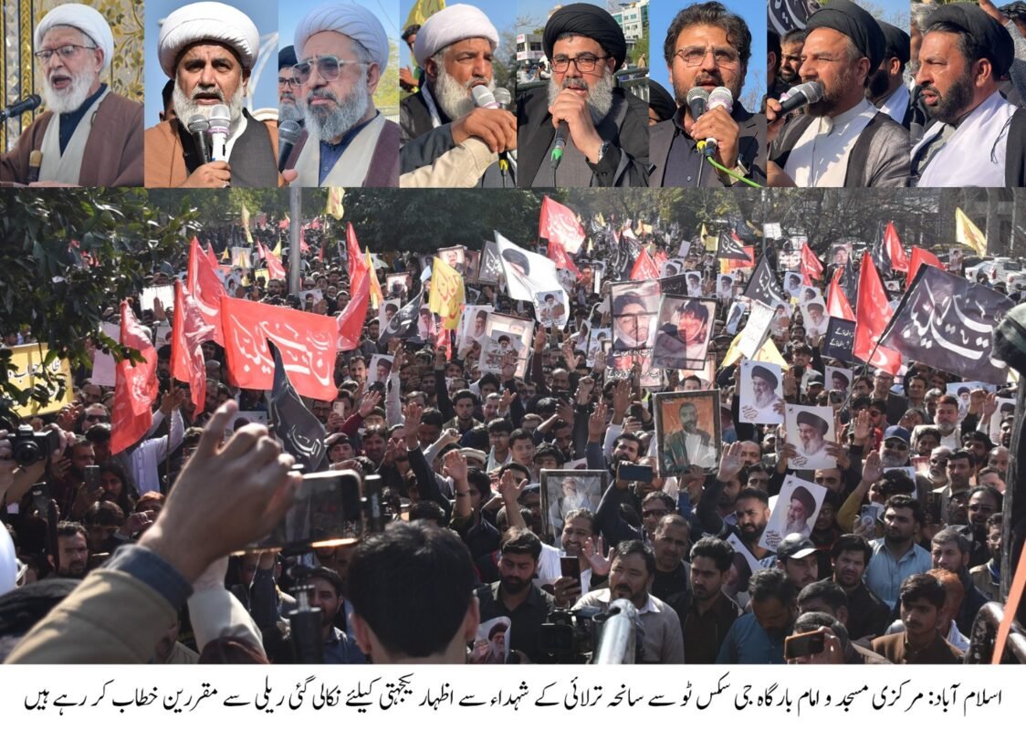 اسلام آباد میں سانحہ ترلائی کے شہداء سے اظہارِ یکجہتی اور دہشت گردی کے خلاف ملتِ جعفریہ پاکستان کے زیر اہتمام امام بارگاہ جی سکس ٹو سے ایک عظیم الشان احتجاجی ریلی نکالی گئی جس میں ہزاروں مرد و خواتین نے شرکت کی۔ مرکزی اجتماع سے علامہ شیخ شفاء نجفی نے خطاب کیا جبکہ نماز جمعہ کے بعد نکالی گئی ریلی میں شیعہ علماء کونسل پاکستان، مجلس وحدت مسلمین، امامیہ اسٹوڈنٹس آرگنائزیشن، آئی ڈی سی، انجمن جانثاران اور مختلف دینی و ماتمی تنظیموں کے قائدین اور کارکنان شریک ہوئے۔